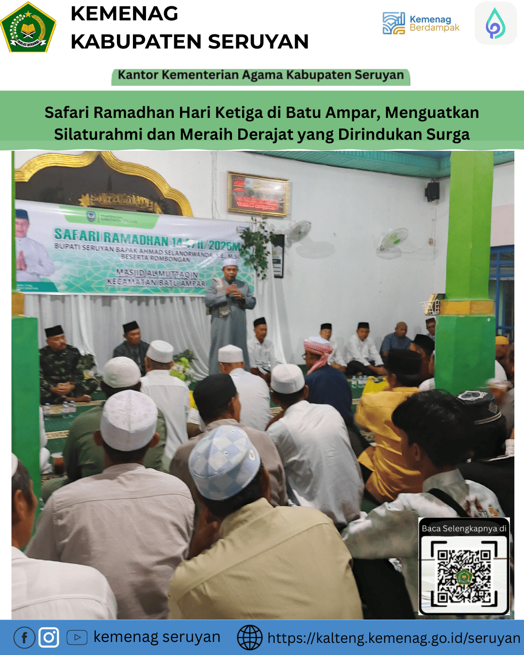 Diunggah Tanggal 24-02-2026 11:00:42 Kakankemenag Seruyan Hadiri Safari Ramadhan Pemkab, Pererat Silaturahmi Hingga Wilayah Sembuluh Seruyan (Humas) Kepala Kantor Kementerian Agama (Kakankemenag) Kabupaten Seruyan, Dr. H. Taufikurrahman, S.Ag., M.Pd.I., menghadiri rangkaian kegiatan... Baca Selengkapnya
